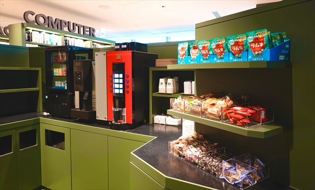 なんと、ラウンジのお菓子やドリンクは飲み放題! ラムネやチョコ、コーヒーなど集中しているときに欲しくなるものが全てそろっています。