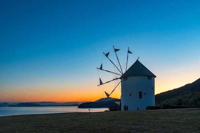 瀬戸内海を見下ろす小高い丘にある白いギリシャ風車は絶景ポイント。