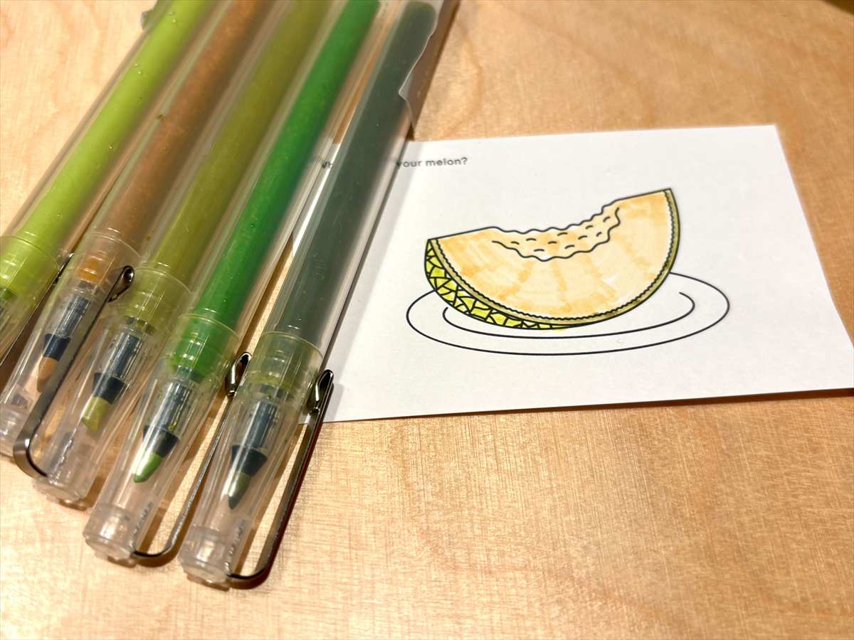 しかし、この「オリジナルメロンink」は客席で体験することができます。カトラリー容器の中にメロンのイラストとともに、メロンinkのペンが用意されているので、料理を待っている間に塗り絵を楽しむことができます! まるで子どものころに戻ったような楽しいです!