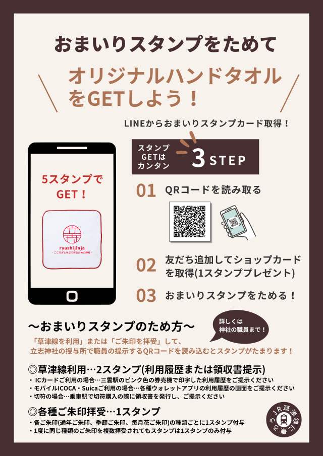 公式LINEのおまいりスタンプカードでは、御朱印の拝受や草津線の利用に応じてスタンプの付与やオリジナルハンドタオル、神社ゆかりの特典をプレゼント。