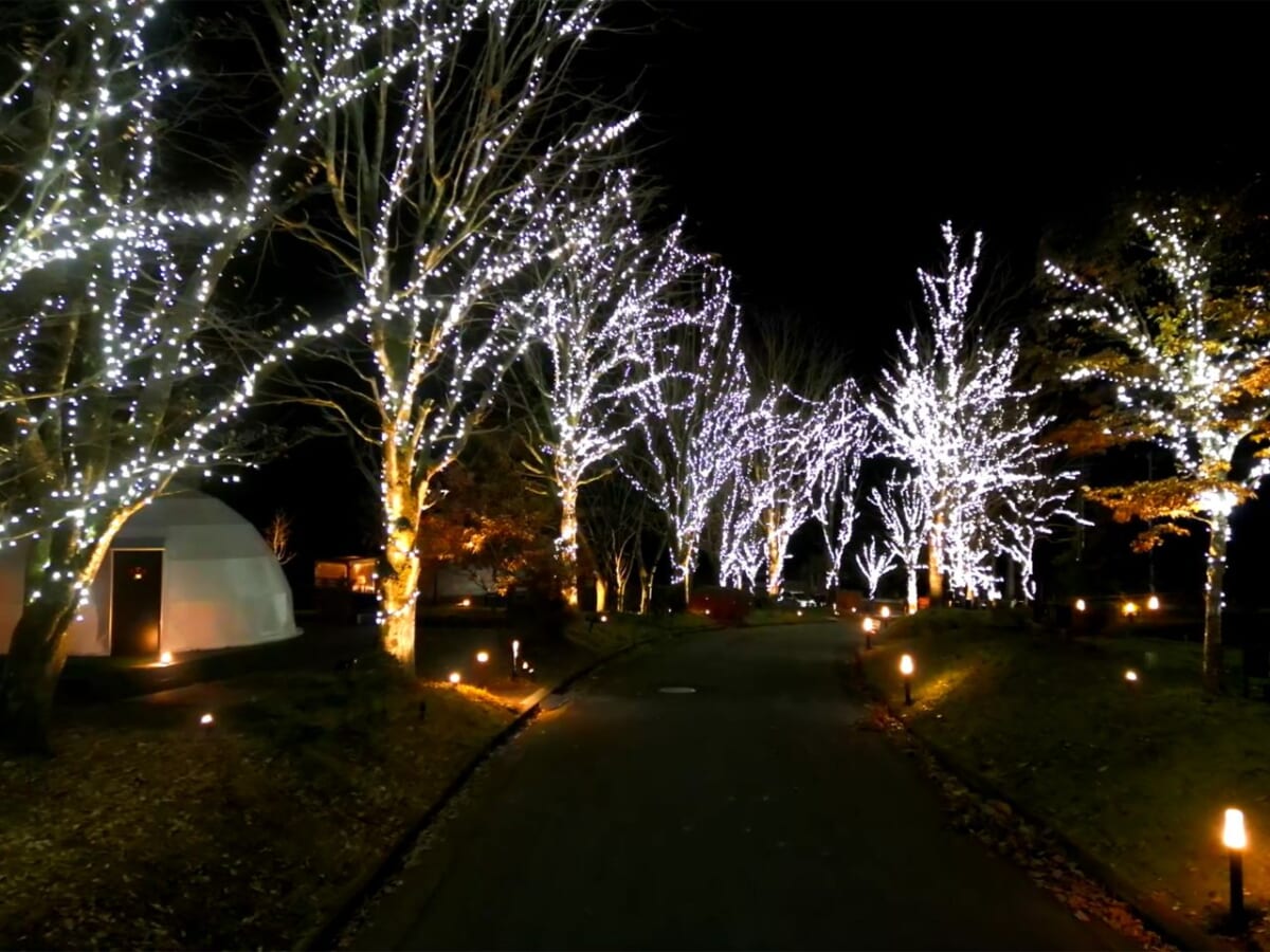 入口から続く並木道30本に約38,000球、メインツリーとサインボードに約2,000球、合計約4万球のLEDイルミネーションが点灯します。冬の澄んだ空気の中、幻想的で煌びやかな光が施設全体を包み込み、来場する人々を夢の世界へと誘ってくれそうです。