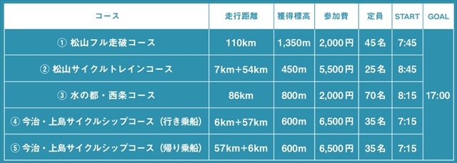 同イベントでは、レベルや目的に応じて選べる5つのコースを用意。道後温泉や水の都・西条、ゆめしま海道など、サイクリングと観光を同時に楽しめる構成になっています。