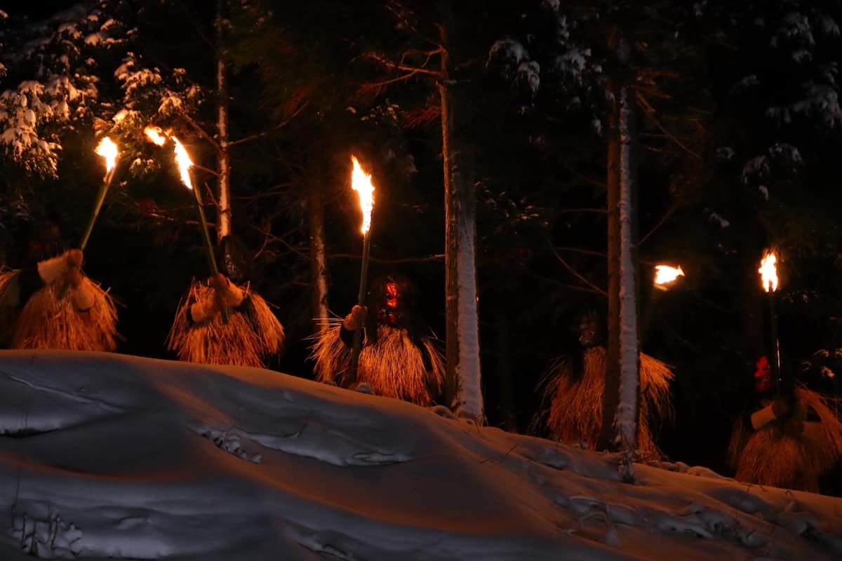 「なまはげ踊り」。なまはげ柴灯まつりは、900年以上前から毎年1月3日に真山神社で行われている神事「柴灯祭(さいとうさい)」と、民俗行事「なまはげ」を組み合わせた冬の観光行事