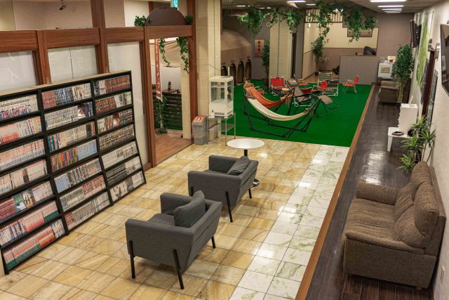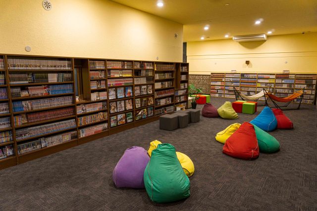 また、休憩ラウンジには3,000冊のコミックがそろい、自然の風が吹き抜けるテラス席で優雅な時間を過ごせます。