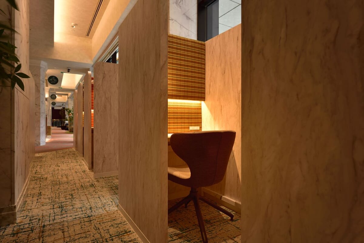 Free Wi-Fiと電源を備えた個人ワークスペースを11席用意。サウナ後の休息とワークをシームレスにつなぐ環境が整っています。