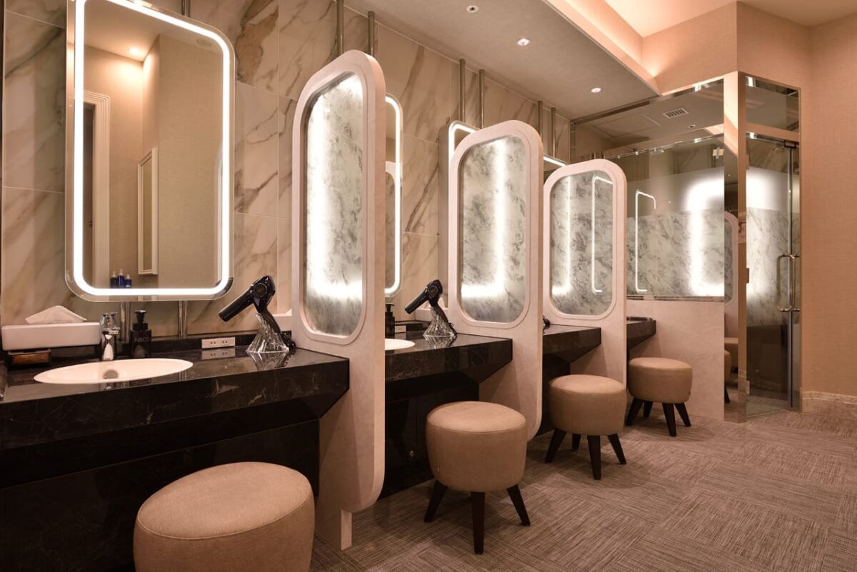 男女浴室のシャワーヘッドおよびパウダールームのヘアドライヤーには、美容ブランドReFa(リファ)の最新モデルが採用されています。