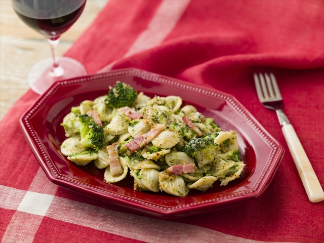 耳たぶのような形が特徴のショートパスタに、鮮やかなブロッコリーソースと熟成ベーコンを合わせた一皿。香草パン粉の香ばしさもポイントです。