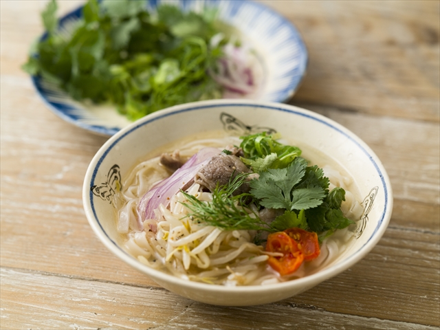 牛出汁の旨みとスパイス、ハーブの香りが調和した本格派フォー。九条葱やドライトマトがアクセントになり、最後まで飽きずに楽しめます。
